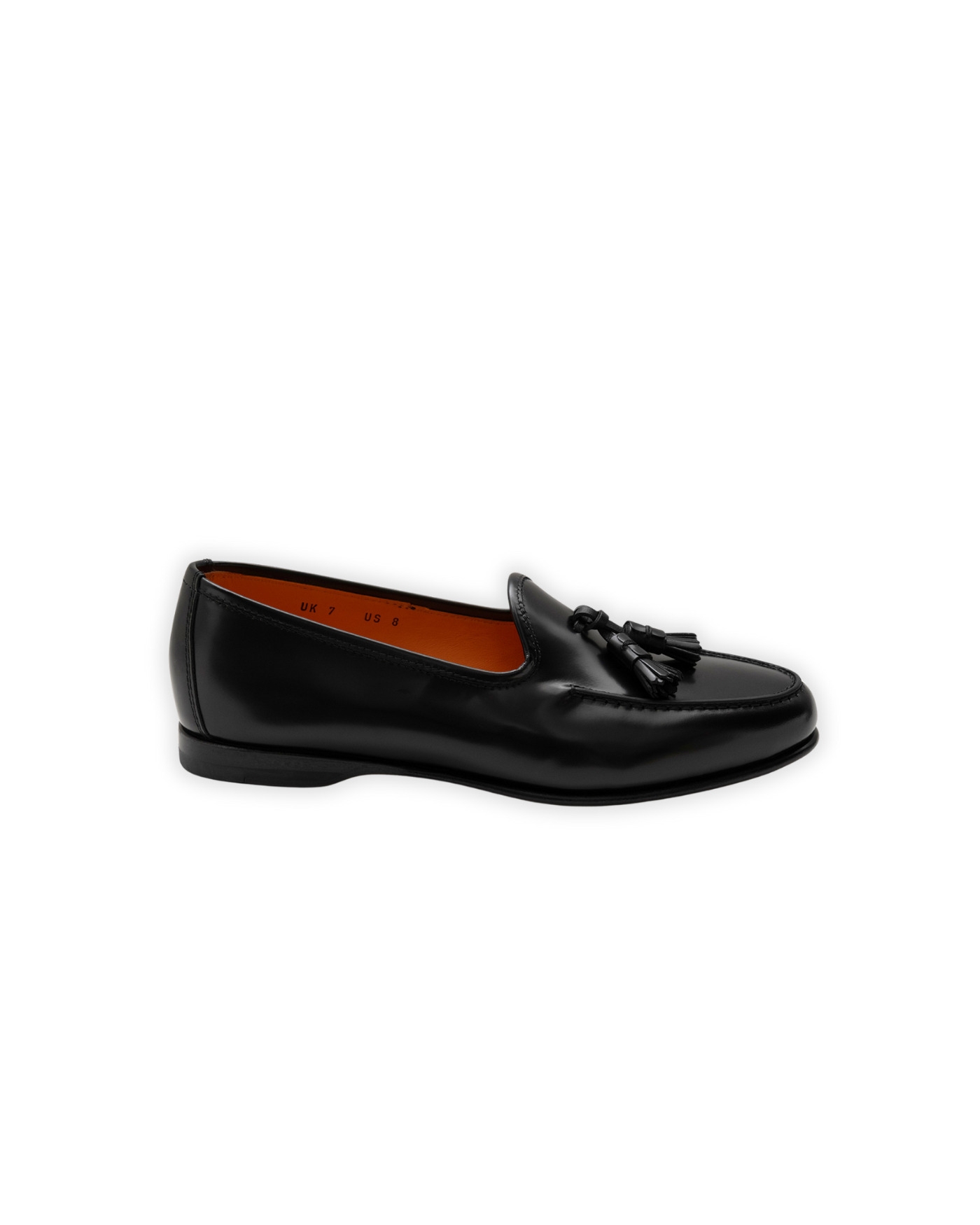 Details - Crafted from enamelled leather - Tassel - Woven apron trim - Flexible Goodyear construction - Leather sole with half rubber heel - Santoni logo on the insole Make and fit - Runs big, we advise taking one size smaller - Made in Italy